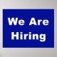 Um poster azul moderno para uma janela da loja notificando o público de que você está contratando um novo funcionarios.