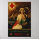 Um poster da Primeira Guerra Mundial mostrando uma enfermeira da Cruz Vermelha segurando uma jovem, com quatro cavaleiros representando a guerra atrás. Criado por Cornelius Hicks.