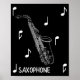 Esboço branco sobre gráfico saxofone, notas de música e texto "saxofone".