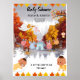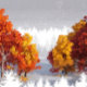 Uma ilustração do outono de um vasto fundo branco de neve com as silhuetas de montanhas e árvores à distância. As montanhas e árvores se esticam muito no horizonte, criando uma atmosfera serena e tranquila. O chão está coberto de laranja e folhas amarelas vibrantes, adicionando um pop de cor à cena.