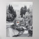 Este intrincado esboço de lápis captura a beleza serena de uma pequena aldeia aninhada ao longo de um suave rio. Isso evoca um sentimento de charme pacífico e elegância eterno. As linhas detalhadas criam uma paisagem texturizada, desde as árvores esmagadoras e torrejadoras no fundo até a água ondulante refletindo o céu. As cascas, com seus telhados tradicionais e pequenas janelas, alinham um caminho enrolamento que segue a borda do rio. Um pop de cor vermelha-de-laranja-quente das caixas de flores de uma das casas adiciona um sutil toque de vida e calor à cena, de outra forma monocromática. Esta peça seria uma adição perfeita a uma parede de galeria ou como um ponto focal autônomo. É ideal para espaços que abraçam uma estética clássica, acolhedora e inspirada na natureza.