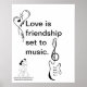 Celebrar a harmonia do amor e da amizade com esta impressão de arte única, Love é Friendship Set to Music, de Michael Carter. Apresentando uma design minimalista com notas musicais formando um coração e uma guitarra, ao lado de uma elegante dança de casal, esta peça captura lindamente a ideia de que o verdadeiro amor é construído sobre a base da amizade. A frase "O amor é a amizade definida para a música" destaca a alegria, o ritmo e a harmonia que o amor traz para nossas vidas. Esta trabalho de arte é perfeita para amantes da música, casais, e qualquer um que aprecie a conexão entre amor e amizade. Ideal para aniversários, casamentos, ou como um presente pensativo para alguém especial, esta impressão faz uma adição adorável a qualquer decoração caseira.