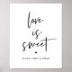 Sinal de Mesa do Deserto de Casamento, O Amor é doce, por favor, façam um brinde, em Escrito Minimalista Moderno, Teto Negro e Branco. Esta placa está disponível na versão para download/ editável e na versão para cópia impressa. para seu ensaio de casamento e alegremente para sempre após comemoração de janto e festa.