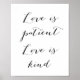 Linda caligrafia escrevendo a tinta preta em um fundo branco, "O amor é paciente, o amor é gentil" - impressão de arte para decorar seu casamento ou em qualquer lugar em sua casa!