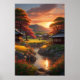 Ninho no sereno campo japonês, uma aldeia pacífica encantada com suas casas tradicionais que estendem as margens dos rios. À distância, uma colina gentil esconde um brilho laranja à medida que o sol se põe. As águas tranquilas do rio espelham a cena idílica, criando um quadro de beleza e tranquilidade harmoniosas.