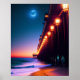 Linda arte digital para amantes de praia mostra um píer com postes iluminados e uma lua de cheio brilhando ao anoitecer. Design criado com o uso do software AI.