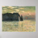 Um penhasco grande esculpido pelas ondas é para um lado dessa pintura. O sol é uma bola vermelha brilhante no céu enquanto se põe no horizonte.