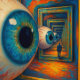 "O Corredor de Ver" - Um Retrato Surreal. Um vasto corredor espelhado estende-se para a eternidade, cada segmento segurando um olho enorme e atento. No seu centro, um homem fica imóvel sem ver o seu próprio reflexo, perdido no olhar infinito. A pintura estilizada equilibra calor e frio, distância e intimidade, em uma meditação sobre percepção, tempo, e o confronto silencioso entre o eu e o infinito.