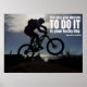 Provérbio japonês - "O dia em que você decide fazer isso é seu dia de sorte"! Poster com motociclista de montanha, foto ao estilo da silhueta com sol atrás, primeiro plano escuro, cena de ação com água e luz solar. Motivação, inspiração, impulso, sucesso! Você consegue! Este poster parece excelente em sala de estar, quarto, quarto de criança, quarto de família, sala de exercício, garagem, compro de bicicleta, onde você quiser. Aproveite o dia.