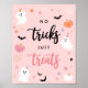 O fantasma rosa fofo e assustador do Halloween sem truques só trata poster. Design moderno do Dia das Bruxas para uma festa assustadora! Esta placa de aniversário apresenta teias de aranha, fantasmas, abóboras, morcegos, aranhas, folhas, cornas, estrelas e margaridas. Esta placa é excelente para festas de aniversário de garotinha!
