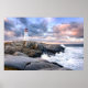 O farol de Peggy Cove no pôr do sol com nuvens dramáticas e um surf.