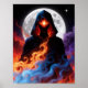 Uma figura camuflada fica debaixo do brilhantismo de uma lua de cheio, seu rosto consumido por um fogo e luz derretida. Os olhos gêmeos queimam como brasas, e do seu capô sobem chamas vivas de laranja e ondas de azul etéreo, se torcendo juntos em uma dança interminável. Sombras e fumaça nas costas como se a própria noite se curvasse à sua presença. Este ser parece divino e destrutivo — um guardião elementar ou um prendedor do lado de fora das estrelas, irradiando uma potência que desfoca a linha entre criação e aniquilação.