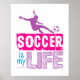 Poster de futebol feminino colorida com o texto, "SOCCER é minha vida". Tem uma silhueta de futebol jogando uma bola de futebol sobre o texto. ©gollygirls.com
