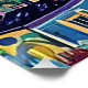A.I.criou impressão de um céu noturno estrelado e luonado que mostra um gato negro no primeiro plano, colocado contra uma paisagem de edifícios de vilarejos quentes e casas coloridas.