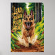 Um cão German shepherd corre por um caminho de floresta exuberante, chutando a sujeira e saindo à medida que se move para a frente. O cachorro tem uma coleira acoplada à sua coleira, e sua língua está se esbanjando em prazer. O fundo apresenta uma floresta verde vibrante e uma citação sobre liderar com força e acompanhamento com coração