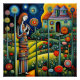 A.I. A impressão de uma jovem criada está num campo de flores altas e coloridas com uma única casa construída no fundo sob um céu noturno acima está cheia de padrões luminescentes giratórios.