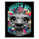 Uma avestruz com traços exagerados é representada contra um fundo vibrante e colorido, com a frase "O QUE ESTÁ ACESO?" em letras negrito acima da cabeça. O trabalho de arte combina elementos de estilos de pop e cinzas, criando uma tela atraente.