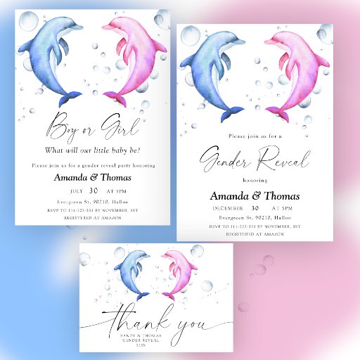 Menino ou Menina. Azul ou Rosa. Pink de aquarela e golfinhos azuis com gênero revelam festa. A festa reveladora de gênero é decorada com bolhas de água.