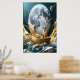 Um homem em um barco pesca sob uma lua gigante e brilhante. A cena é surreal, com o barco e a paisagem ao redor aparentando ser feita de ouro. Natação de golfinhos nas ondas abaixo.