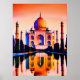 Poster em uma ilustração do Taj Mahal, refletida na água, e apoiada por um profundo céu ensolarado de laranja coral
