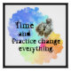 Parte da série Motivational mantra, para professores, treinadores, desenvolvimento pessoal, ou se você gosta apenas de imagem e texto. O tempo e a prática mudam tudo, é o que eu ensino aos meus alunos de arte e ginástica. Funciona para qualquer disciplina. Escrita negra decorativa numa nuvem de arco-íris florescente, com um relógio antigo. Design gráfico original com borda preta em negrito.