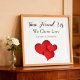 Citação O Tempo Nos Encontrou Nós Escolhemos o Amor com corações vermelhos sobrepostos em um fundo branco limpo. Um design minimalista romântico perfeito para casais, casamentos, aniversários e Dia dos Namorados. Arte de parede de citação de amor elegante que celebra o compromisso e a conexão.