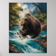 Um urso majestoso é representado segurando um peixe cercado nas suas patas, capturando um momento de naturezas brutas beleza e força.