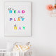 Poster para o quarto do seu filho. "Leitura e Reprodução do Vamos o dia todo" em cores vibrantes e pastéis.