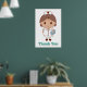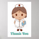 Enfermeira bonita com uniforme branco e chapéu e cabelo castanho, ela está segurando um arquivo médico azul. Abaixo, em letras azuis, estão as palavras Obrigado.