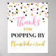 Obrigados de popcorn bar para chá de fraldas, chá de panela, festa de aniversário ou casamento em um padrão de confete rosa, preto e ouro.