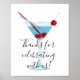 A impressão de parede divertida e moderna apresenta um texto personalizável de "obrigados para celebrar conosco" em uma fonte elegante e florescente com um coquetel azul / ilustração de água de vidro martini.