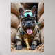 Ele não está jogando — ele está implantado. Cabo Kibble se agarrava atrás de uma parede de sacola, escondido no camo do deserto do cheio com joelhos, um colete tático, e óculos de visão noturna estrelados em sua cabeça. Na pata dele? Um osso de borracha, mantido com gravidade fatal. Seu colete diz "FETCH 6", e seu walkie está vivo com comandos de latir. A língua dele pode sair, mas este filhote está pronto para ação. Perfeito para fãs militares e colecionadores engraçados de arte canina.