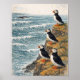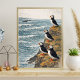 The textured, antique-style design evokes the look of traditional vintage bird engravings and coastal art prints, creating a timeless aesthetic ideal for beach homes, seaside cottages, marine-themed rooms, or nature-inspired spaces. The striking contrast of the puffins’ black and white feathers with their bright orange beaks and feet adds a vibrant touch against the calming blue ocean background.