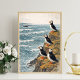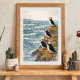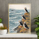 Capture the beauty of the wild coast with this charming vintage-style puffin illustration featuring four seabirds perched on rugged seaside cliffs overlooking rolling ocean waves. This elegant coastal wildlife artwork blends classic natural history illustration with a peaceful nautical landscape, making it perfect for ocean lovers, bird enthusiasts, and nature-inspired décor.