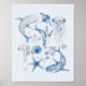 Este impressão de arte temática oceânica apresenta uma variedade de elementos criaturas marinhas em aquarelas azuis e cor-de-rosa, incluindo baleias, águas-vivas, corais, conchas marítimas e muito mais. Esta design funciona como excelente para alguém que ama o mar, a vida marinha e as aquarelas.