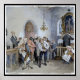 Imagem de arte vítrea do pastor que prega em sua igreja como pessoas dão uma oferta. Trabalho de arte do pintor norueguês Knud Bergslien>
