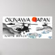 Esta praia branca, Okinawa, Poster do Japão apresenta uma montanha e uma paisagem insular com o Mar das Filipinas. Há helicópteros militares, um navio de guerra e o sol de pôr. ^