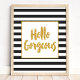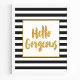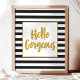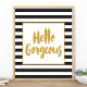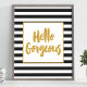 Linda e moderna citação de pincel da tipografia moderna. "Olá, linda". Apresentando um bonito quadro luminoso metálico dourado e letras douradas com listras pretas e brancas.