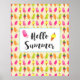 Um poster com a imagem de um padrão de tempo de Verão de picolés e sorvetes em aquarelas. Olá Summer escreveu em uma fonte de tendências divertida.