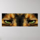 Os olhos verdes de um gato com minúsculas faíscas em forma de estrela estão olhando para fora desta poster. Seu lindo pelo castanho e preto envolve os olhos.