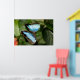 A vibrant blue butterfly rests delicately on a lush green leaf, its wings spread widely to display their iridescent hues. The surrounding foliage provides a natural and serene backdrop, enhancing the butterfly's striking coloration.