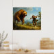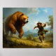 A man dressed in historical clothing runs frantically across a meadow as a massive bear charges towards him. The background reveals a distant castle set against a mountainous landscape, contributing to the dramatic and fantastical nature of the scene. The lighting and detail create a sense of urgency and danger.