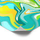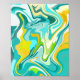 Este design contém um padrão de abstrato com formas fluidas, semelhantes a ondas, em tons brilhantes de turquesa, lacre, amarelo e verde. A composição sugere um senso de movimento e energia, evocando elementos naturais como ondas do oceano ou água fluindo.