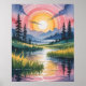 A bold psychedelic watercolor with a radiant sun encircled by pink ripples rising over a reflective river. Dark pine trees frame lush green meadows and distant blue mountains under a vibrant pink-to-purple sky, radiating epic energy and cosmic serenity.