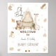 Placa de boas-vindas de orçamento de chá de bebê em berçário Boho em estilo vintage com aquarela! Adornada com ilustrações adoráveis de uma doce girafa, ursinho de bebê fofo, plantas exuberantes, um berço aconchegante e brinquedos vintage charmosos. Não se esqueça de explorar toda a coleção.