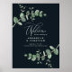 Belo delicado eucalipto foliage orçamento de casamento sinal de boas-vindas design. Coleção moderna e elegante sobre a tendência verde-sábio, preto, azul-marinho e branco-na moda, da rústica contemporânea. Ideal para primavera, verão, outono, outono ou casamentos no inverno.