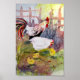 Pintura aquosa de galo, galinha e três pintinhos.