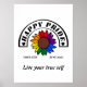 Poster com uma bela ilustração de girassol em cores arco-íris. O texto da tipografia diz "Orgulho Feliz" e "Viva seu verdadeiro eu". Você também pode escrever sua cidade e data. Você pode personalizar imagem e texto. Personalize seu item e faça dele um de um tipo! Visite nossa loja para mais designs.