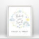 Um chá branco, bonitinho bebezinho, toma um cartaz de poster com aquarela azul pastel e amarela de um arco-íris, sol, corações, estrelas, luas e nuvens e "Os bebês são doces" em um roteiro de na moda caligrafia.