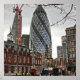 O icônico arranha-céu moderno com um design geométrico único se destaca de forma proeminente contra um pano de fundo de um céu vibrante, enquanto edifícios históricos e uma escultura caprichosa são visíveis em primeiro plano. A cena contrasta a arquitetura contemporânea com as estruturas clássicas de Londres. Em primeiro plano você notará os outros pepinos de Londres!